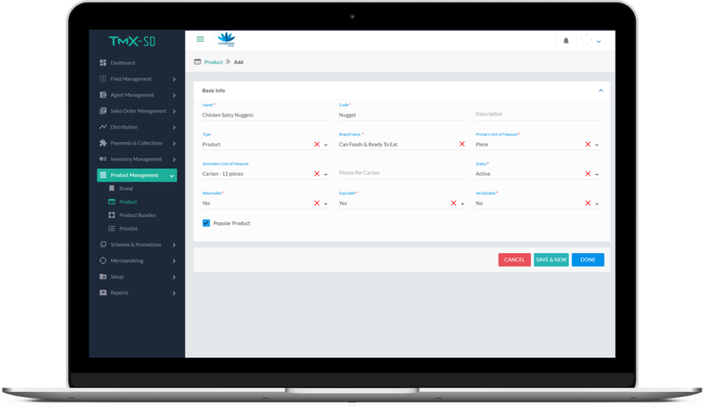 • Define SKUs and related information, either managed entirely within TMX-SD or integrated with an external ERP application.